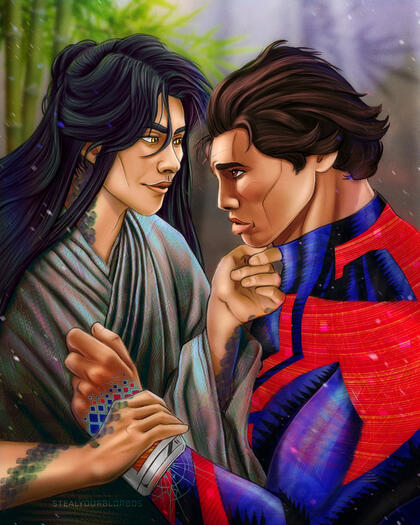 Their relationship began as quite friendly. Although they lack the Spider-Sense most other Spiders boast, their instincts resonate with each other. "You're like me," they said long ago.Through Miguel, Flynn found a new purpose for himself that didn't stem from guilt. The sun rises for another now, and so it shall make the moon shine. This is not done out of a sense of debt; only want. Their roads are lonely ones that should be shared, after all.Flynn and Miguel spent a number of their early days venturing through other worlds โ hiking in the wilderness, eating at restaurants, tag-teaming recruitment when they found the opportunity, and more. A rhythm was easy for them to find. Even with odd discoveries and uncertainties, their resolutions were quiet things. Their louder moments were not in arguments but impassioned research. While both men were typically reticent by habit, open communication was no difficulty between them. Flynn handled Miguel's impatience with his own patience, and Miguel encouraged Flynn to speak his mind more.While at a glance they might seem quite different, they have strong similarities.